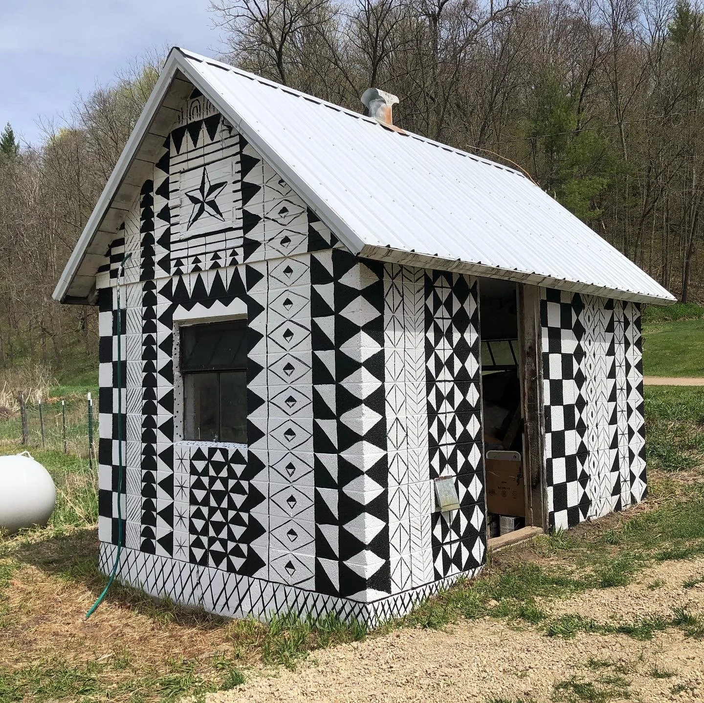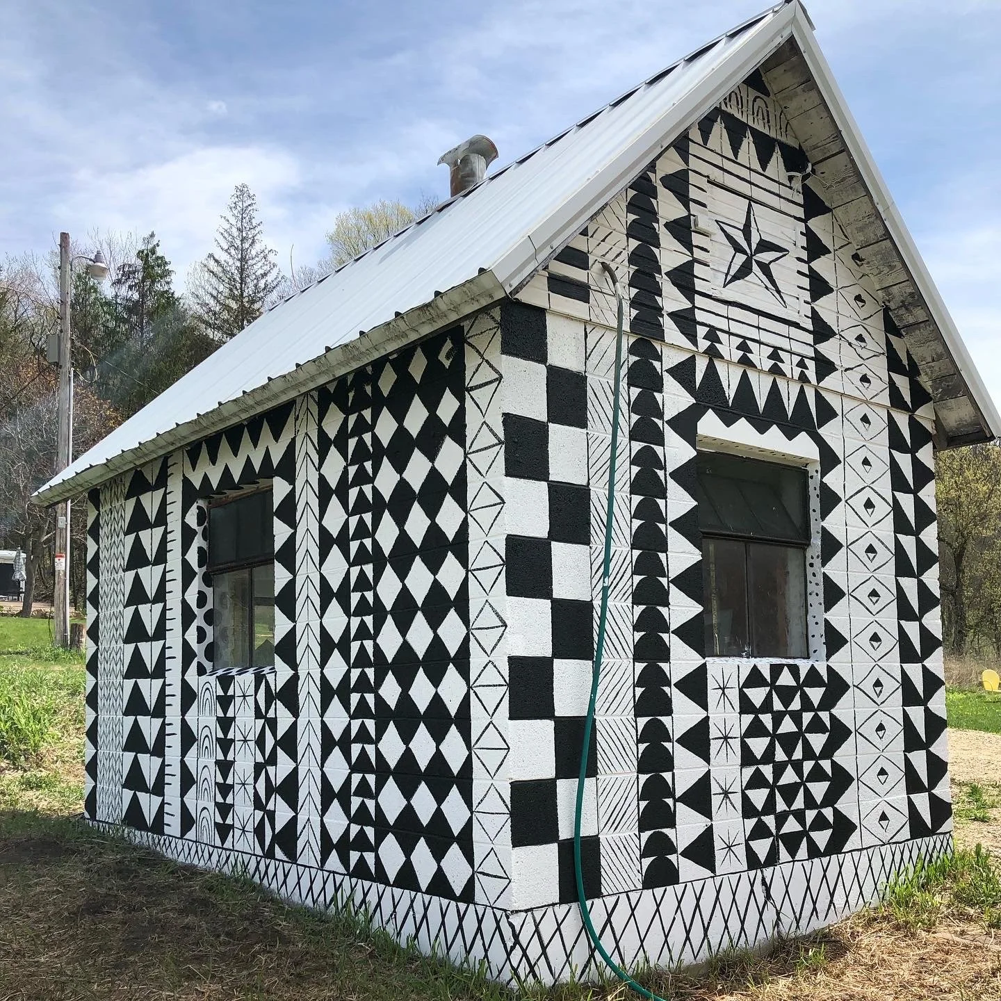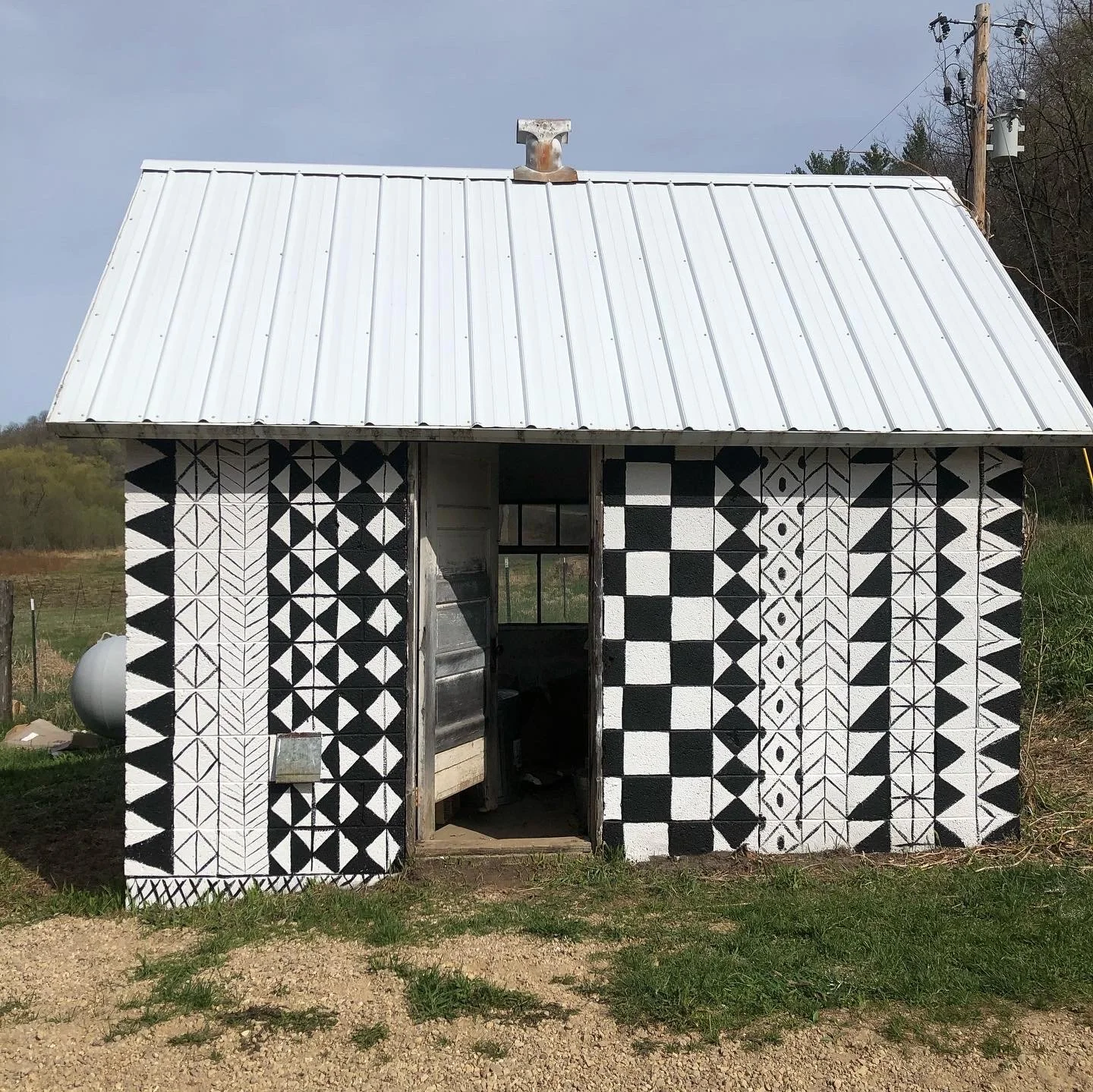 Inspired by the hand-painted houses in the West African village of Tiébélé, the milk shed was painted in improvised bold black + white patterns